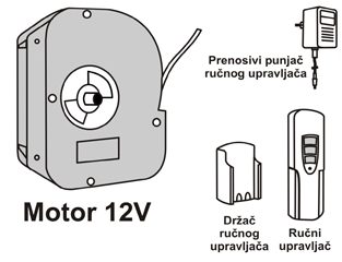 | Glavna odlika ovog novog sistema je 12V motor koji se montira na bočnu stranicu kutije s roletom. Na njega se pomoću dvožilnog kabla spaja nosač ručnog upravljačan koji se montira unutra u blizini prozora. To je sve što se tiče montaže. Ručni upravljač osim što sadrži kontrole za upravljanje sistemom, ima i punjive NiMh baterije. Sa potpuno punim baterijama, roleta se može dizati i spuštati id do 50 puta. Ručni upravljač sastoji se od silikonski oblikovanih tipki i inteligentnim LED indikatorom koji pokazuje operacijske karakteristike i stanje baterije. | |